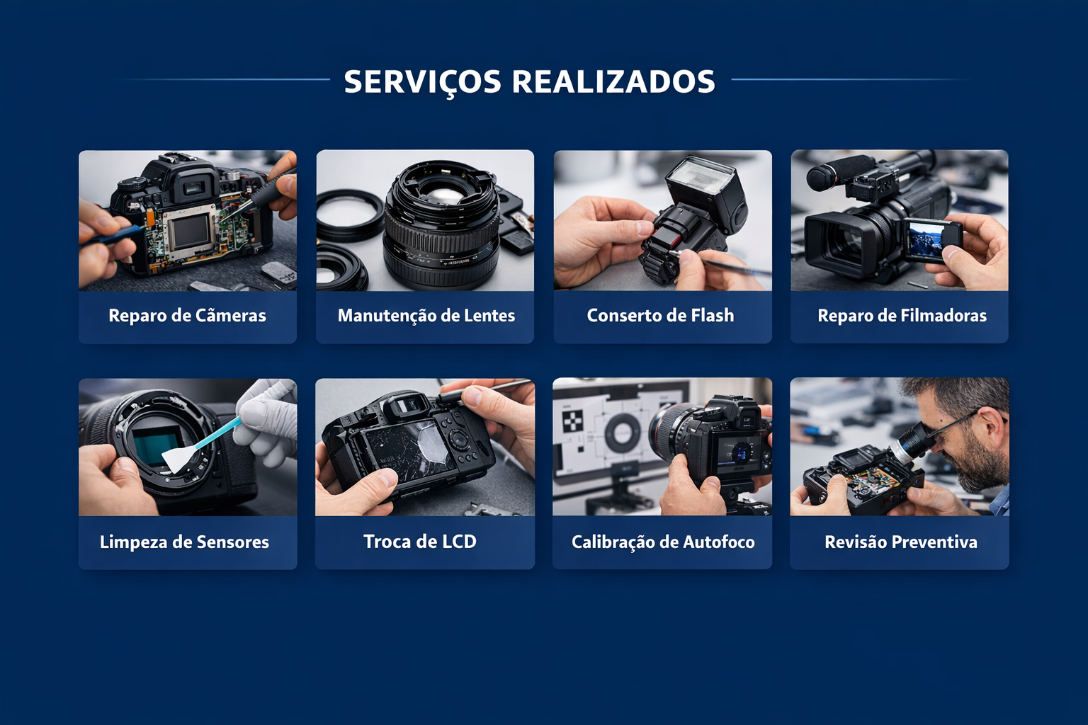 Executamos revisão preventiva e manutenção técnica em câmeras utilizadas por fotógrafos e entusiastas, com experiência em equipamentos Canon, Nikon, Sony e Fujifilm.