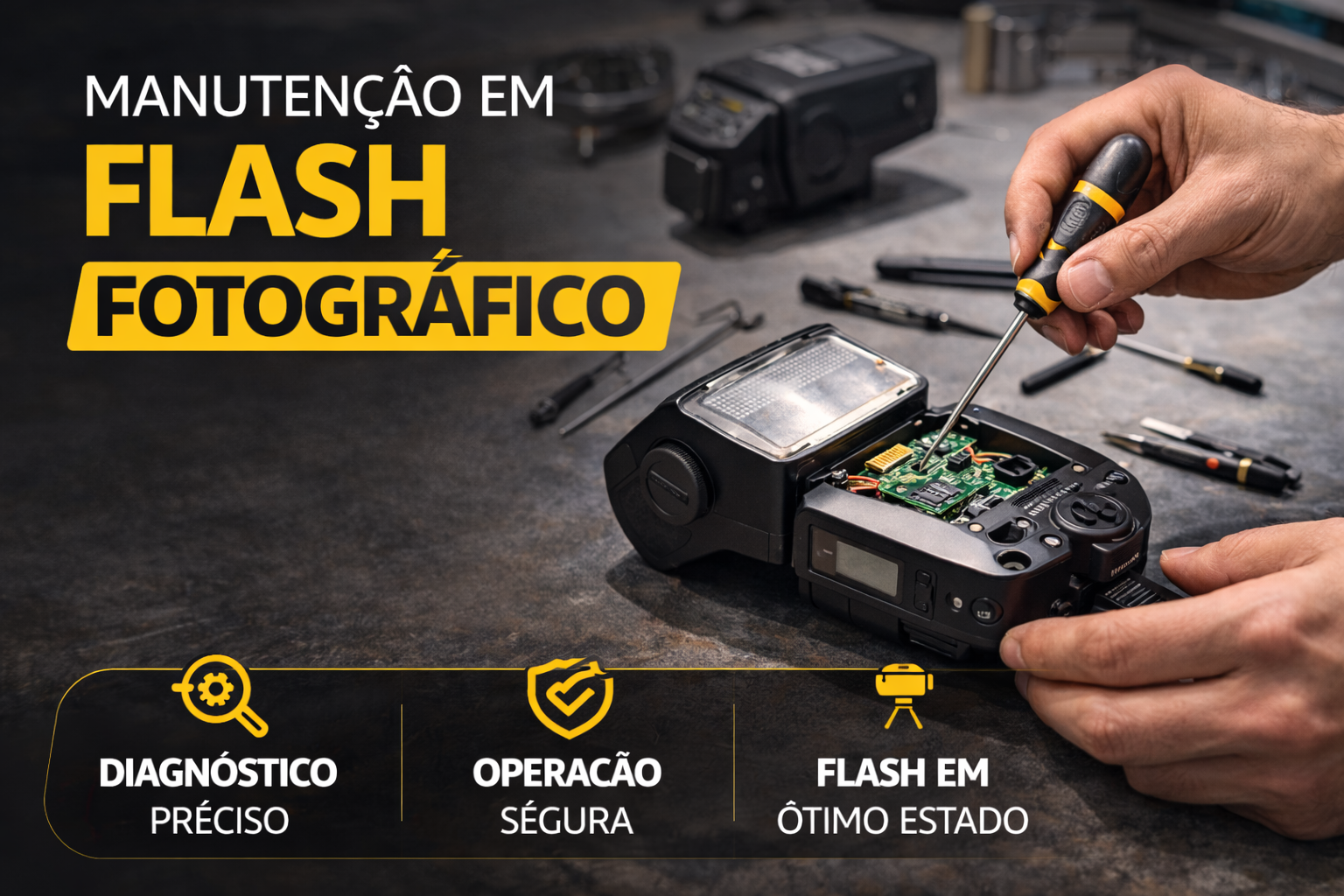 Assistência técnica para flashes utilizados em estúdios e fotografia profissional, trabalhando com equipamentos compatíveis com Canon, Nikon e outras marcas populares como Godox e Yongnuo.